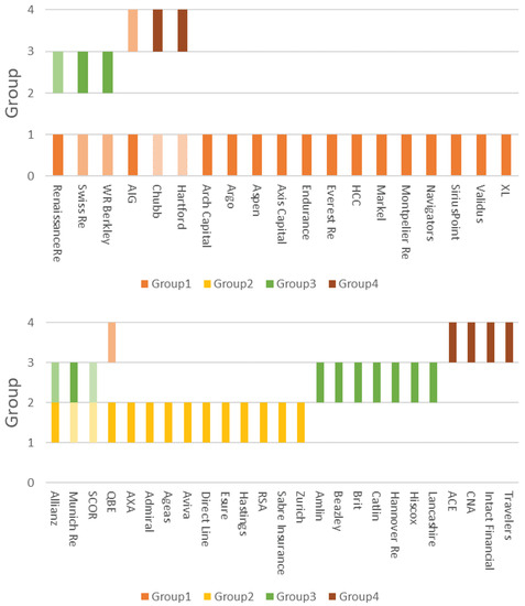 None of the identified topics exhibited obvious links with words that are commonly used to describe an insurer’s profile, making it difficult to interpret the groupings. However, the grouping induced by document allocation across groups/topics appears to some extent to reflect a combination of geographic locations and product focus. For example, Group 1 primarily consists of US-focused commercial insurers; Group 2 consists of largely European-focused insurers with primarily retail customers, and Group 3 are relatively niche specialty insurers operating in the London Market. However, Group 4 displays an overlap with Group 1, as this also contains large global commercial insurers with a significant presence in the US. It is noticeable that Ace acquired Chubb (but retained the Chubb brand) in 2015 (https://news.chubb.com/news-releases?item=122719, last accessed: 14 September 2022) which explains Chubb’s overlap between Groups 1 and 4. A potential area for further investigation is to establish why Swiss Re and WR Berkley display overlaps between Group 1 and 3, and Munich Re between 2 and 3—does this represent a shift in risk profile to more specialty business? These results are not conclusive, but they do highlight possible additional areas for investigation for future research.