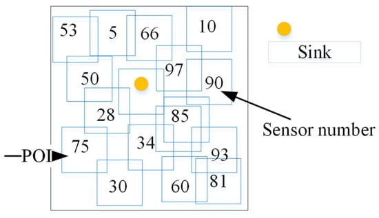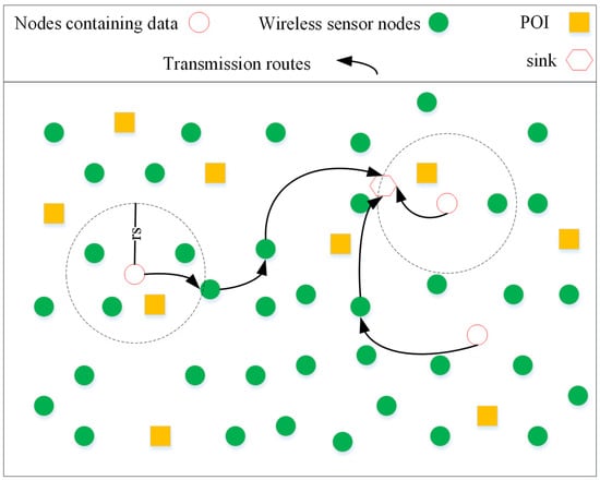 As can be observed from Figure 1, each POI is enclosed by some sensor nodes. If the POI is in the interior of the range of the radio radius, , of a certain sensor, the sensor node detects the event signal and sends the restrained data to the well in multistep.