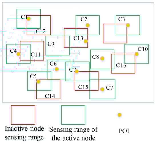 To conserve energy and obtain the optimal coverage ratio, there is an optimal scheduling of nodes in the algorithm, which disables the redundant nodes. From the point of view of encoding particles, string 1111111111000000 represents the example in Figure 4.
