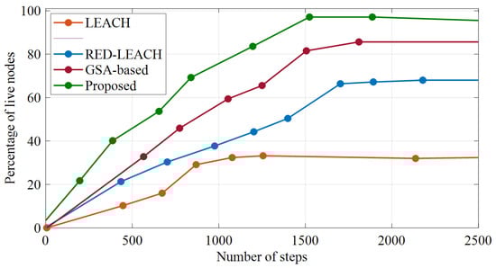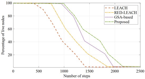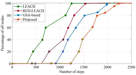 It can be perceived from Figure 7 that, by increasing the number of steps, the energy of the live nodes will eventually run out and turn off. In the LEACH method, after 350 steps, the RED-LEACH method, after 750 steps, and the GSA-based method, after 915 steps, the nodes start shutting down, which occurs after 1227 steps for the proposed method. This means that the nodes are turned off later. Since the first node’s shutdown time is considered in defining the lifetime of the network, this figure indicates that the suggested method offers a longer lifetime. The reason for this improvement is that the proposed method distributes the consumed energy in a balanced way among the network nodes. On the other hand, by increasing the number of steps, the percentage of live nodes in the proposed method works better than that of the other methods. This method means that after almost 2155 steps all of its nodes are turned off, and, until then, the probability of establishing a route for sending packets is higher than that of the other methods.