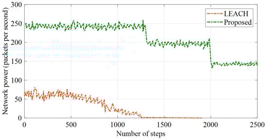 It can be concluded from Figure 10 that the remaining energy in the network decreases with an increase in the number of steps. The slope of this reduction is lower in the proposed technique. Accordingly, this method will have a longer network life. Additionally, the total energy of the network in the LEACH method reaches zero after 1500 steps, after 2000 steps in the RED_LEACH method, after 2400 steps in the PID_LEACH method, and after 2000 steps in the GSA-based method. This means that the probability of sending packets in the suggested technique will be higher than that of the other assessed methods with an increase in the number of data transfer rates.
