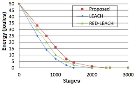 Figure 10 shows the average residual energy in each stage. Here, it is assumed that each node has an initial energy of half a joule. In this case, the network total energy with 110 sensor nodes is equal to 50 joules.