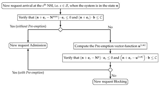 Thus, consider that with an arriving request bound to the via pre-emption admission path at the NSI, , the following consecutive events occur at the system. Firstly, a number