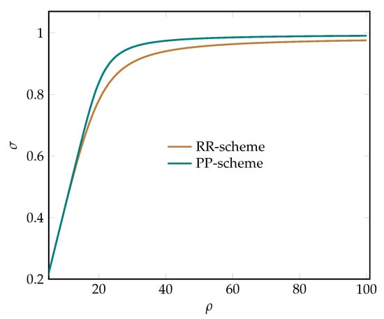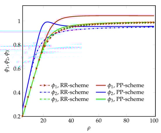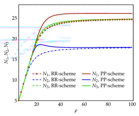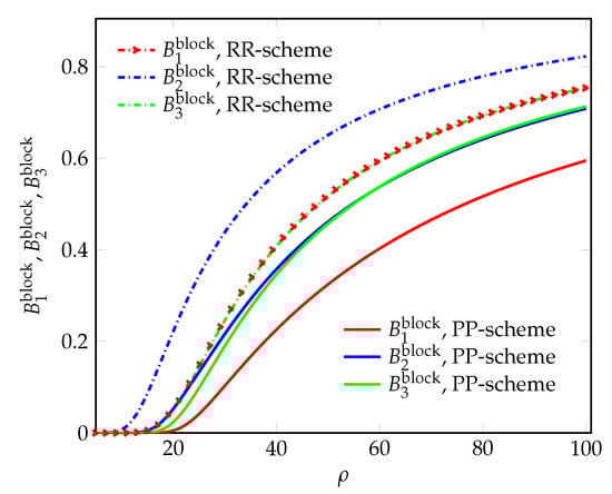 In Figure 10, the average utilization of the guaranteed network capacities improved when using the proposed PP-scheme. This is especially evident for the 2nd NSI in Figure 5 and Figure 7. Indeed, by flexibly using available parts of neighboring guaranteed network capacities of the 1st and/or 3rd NSIs, the 2nd NSI can service more 4K 360-degree VR Panoramic Video requests at middle workload values, i.e., when arriving requests can only be admitted for service with their respective guaranteed network capacities. One can also note that due to the low requirements for the throughput , with a simultaneous increase in the load , the requests of the 1st NSI always manage to occupy the underused capacities of other NSIs, that is why exceeds unity and lies above the rest of the curves.