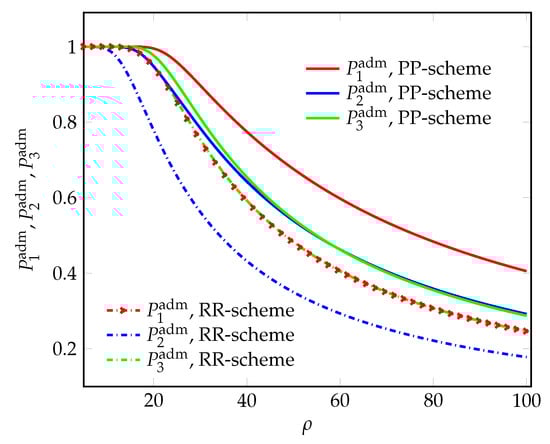 to calculate the probability of an event determined using the main sets (10)–(13). Let and represent the probability of events and , respectively, i.e., the admission and blocking probabilities for arriving requests at the NSI.