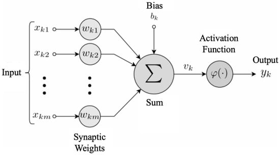 In addition to time series prediction, ANN shows promise for pattern classification [,,], control [,], and optimization. Optimization gains space in this context because of the need to improve the components necessary to maintain the system’s operation [,], especially considering the expansive growth of communication systems [,], Internet of Things [,,], the need for sustainability [,], technology development [], and data privacy [,]. Figure 1 shows a representation of an artificial neuron from a Perceptron Neural Network.