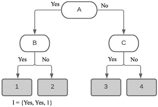 The example in Figure 2 succinctly demonstrates how instance I contains two characteristics: yes and yes. In each node of the tree, a test is executed where a comparison is performed with the features of the instance. The class to which the instance belongs is the third characteristic, which in the case of the example is class 1. By performing the tests, the instance is labeled according to the class of the leaf-node.