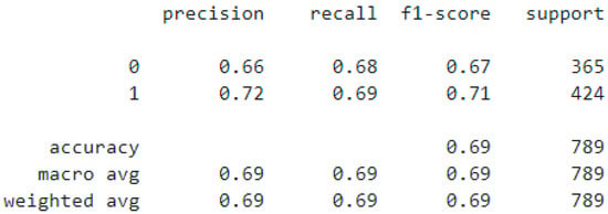 In the metrics presented in Figure 3, the Accuracy obtained with the model was 69%. Data classified as “1” obtained an accuracy of 0.72, recall of 0.69 and F1-score of 0.71. Data classified as “0” obtained a precision of 0.66, recall of 0.68 and F1-score of 0.67. Figure 4 shows the Confusion Matrix of the ANNs.