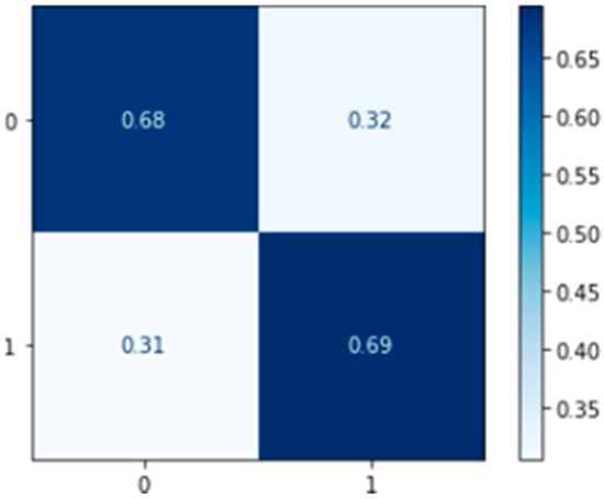 In the Confusion Matrix presented in Figure 4, it is shown that data labeled as “1” are 69% correctly classified. The data labeled as “0” obtained 68% correct classification.