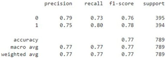The results obtained with each algorithm were compared using the metrics: accuracy, precision, recall, and F1-score. The algorithm that obtained the best classification metrics was Decision Tree. The accuracy obtained with Decision Tree was 0.77. The metrics for Class “0” were accuracy of 0.79, recall of 0.73, and F1-score of 0.76. Metrics for Class “1” were accuracy of 0.75, recall of 0.80, and F1-score of 0.78.