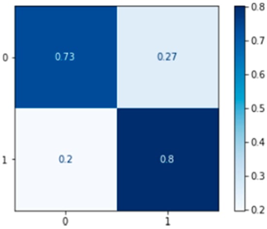 In the Confusion Matrix presented in Figure 6, it is shown that the data labeled as “1” are 80% correctly classified. The data labeled “0” have a 73% correct classification.