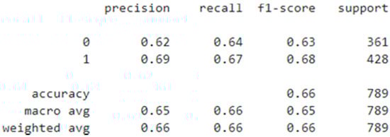 After running GridSearchCV, the best parameters for the Logistic Regression were generated, being class_weight set to “None”, max_iter set to 100 and solver set to “newtoncg”. After setting the Logistic Regression settings, the tests were performed using the 2014–2019 database. The Accuracy obtained with the model was 64%. Data classified as “1” obtained an accuracy of 0.67, recall of 0.89 and F1-score of 0.76. However, data classified as “0” obtained an accuracy of 0.41, recall of 0.14, and F1-score of 0.21. After performing the training and testing using the 2014–2019 database, training and testing was performed using the 1998–2019 database, which obtained the classification metrics shown in Figure 7.