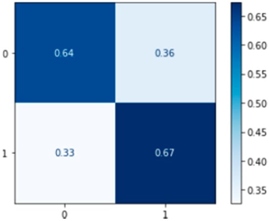 In the Confusion Matrix presented in Figure 8, it is shown that the data labeled as “1” are 67% correctly classified. The data labeled as “0”, on the other hand, have a 64% correct classification.