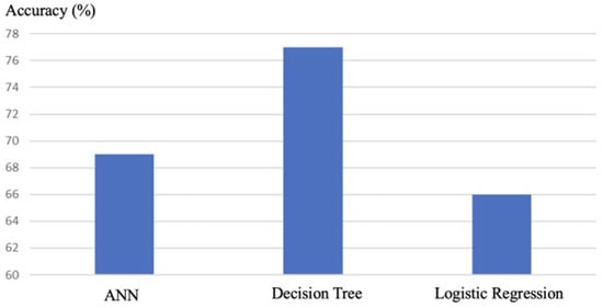 In the graph shown in Figure 9, the Decision Tree has the highest accuracy, with 77%. This is followed by 69% accuracy for the ANNs and 66% for the Logistic Regression. However, to analyze the results in a deeper and more adequate way, it is necessary to analyze the classification metrics, as presented in Figure 10.