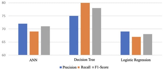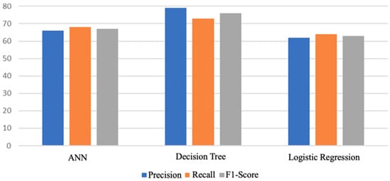 In the graph shown in Figure 10, the metrics for the three algorithms are presented. The ANN has an accuracy of 0.72, recall of 0.69 and F1-score of 0.71. The Decision Tree has an accuracy of 0.75, recall of 0.80 and F1-score of 0.78. Finally, the Logistic Regression has an accuracy of 0.69, recall of 0.67 and F1-score of 0.68. Decision Tree obtained higher values for its classification metrics compared to the other algorithms. It is worth noting that the Recall of the Decision Tree was higher than the Precision and F1-score. This indicates that the algorithm obtained a low number of false negatives for Class “1”. Figure 11 shows the metrics obtained with the three algorithms for Class “0”.