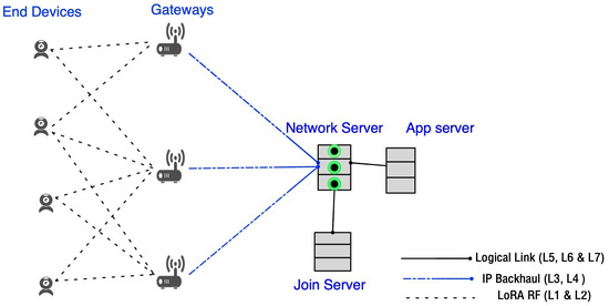 The best-known low-power wide area network (LPWAN) technologies working on the unlicensed band are Sigfox [2] and LoRa [3]. However, the latter, which is the subject of our study, is the most popular thanks to some of its characteristics that are essential for some IoT applications such as smart cities and industry 4.0. Among these characteristics are the downlink channel, which is necessary for the functionalities of the control-command mode, the capacity of this technology to support traffic, and the consideration of mobility. LoRa remains the most widespread technology on the market and the most documented in terms of research thanks to its free media access control (MAC) LoRaWAN protocol promoted by the LoRa alliance [3]. LoRaWAN presents a better quality ratio compared to the investment costs for the smart city, smart grids, smart farming, and remote monitoring systems [4]. Its architecture is star-of-star, as depicted in Figure 1, where each element works at one or more OSI layers (physical (L1), datalink (L2), network (L3), transport (L4), session (L5), presentation (L6), application (L7)). Specifically, the end device works at layers L1 and L2. The GW works at layers L1, L2, L3, and L4. The servers work at all layers.