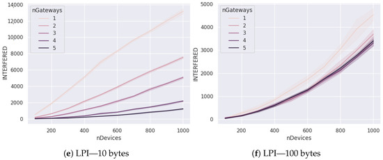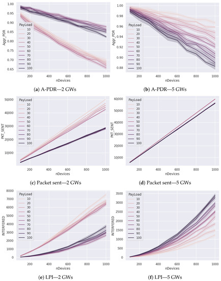 Figure 6 shows the obtained results for 10 and 100 bytes of payload length while varying the gateway number with a frequency of 1 packet/min and with unconfirmed traffic. We can see from Figure 6a,b that, as expected, the more gateways we used, the higher the A-PDR that was achieved. In addition, we can see that the A-PDR decreased as the number of EDs increased, mainly in the case of 100 bytes. From Figure 6c,d, we can see clearly that when the number of gateways increased, the number of packets sent also increased, regardless of the payload length. Such behaviour can be explained by the fact that using more gateways will make the ED use a low value (e.g., ), which allows them to send more packets, as we can see in Table 4 and Table 5. Finally, Figure 6e,f show that by increasing the number of gateways, the LPI indicator decreased considerably compared to the case of using one or two gateways. In addition, using a high payload length led to a low LPI compared to using a low payload length. As previously stated, such behaviour can be explained by the fact that with more gateways, the ED uses a low value (e.g., ), which leads it to send packets with low airtime. So, gateways will have a low probability of facing interferences and thus lose packets.