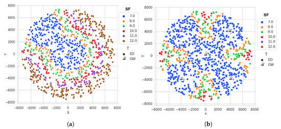 (a) SF allocation with 2 GWs; (b) SF allocation with 5 GWs. allocation according to the number of gateways deployed in the case of 1000 EDs.