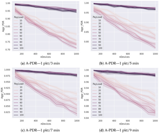 In this subsection, we study three scenarios to show how the payload length impacts the A-PDR and how it interacts when varying the sending packet frequency, the packet payload, the number of gateways, and the number of nodes, with and without confirmed traffic.