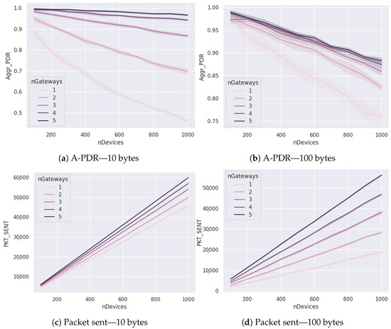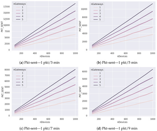Figure 7 shows the results obtained for a payload of 100 bytes while varying the gateway number with a different frequency of sending packets and unconfirmed traffic. Typically, with one packet every 3, 5, 7, and 9 min, the behaviour was still the same, as we can see in Figure 7a–d. These figures confirm that increasing the number of gateways leads to a higher number of packets sent.
