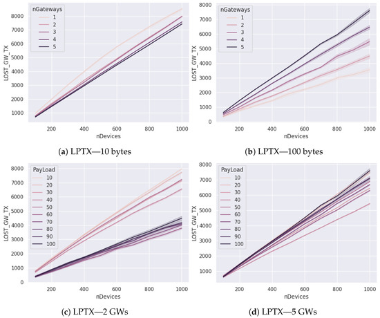 Figure 8c,d show the obtained LPTX value for the case of two and five gateways, respectively, while varying the payload length. In Figure 8c, we can see that with a low payload length (10 to 50 bytes), we obtained a very high LPTX value compared to the case of using a high payload length (more than 60 bytes), mainly when the number of EDs increased. In Figure 8d, we can see that the LPTX value remained roughly the same for five gateways, even if we vary the payload length.