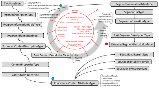On the other hand, in the TV-Anytime standard, in Figure 1 from the red dot you can see the selected elements necessary to describe one or more educational segments of the content. Of this structure, the element ExtendedSegmentDescriptionType was conserved to add the element ContextAttributes which permits describing the attributes of the educational context of the content. This last element’s type of data must be implemented employing the element EducationalContextAttributes, as indicated previously. Figure 1 show a segment description example. The red circle in the center describes, also counterclockwise, the elements that are added to a search in the field of Biology with the question “What is a species and what is a hybrid.”