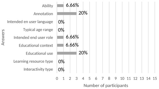 - The educational metadata that the Learning Object Metadata for COlombia (LOM-CO) application profile established as obligatory by the National Ministry of Education of Colombia: “interactivity type”, “interactivity level”, “intended end user role” and “context” [33]. Of this metadata, “interactivity level” was eliminated because, in an audiovisual resource, the user plays a passive role, with no interaction.
