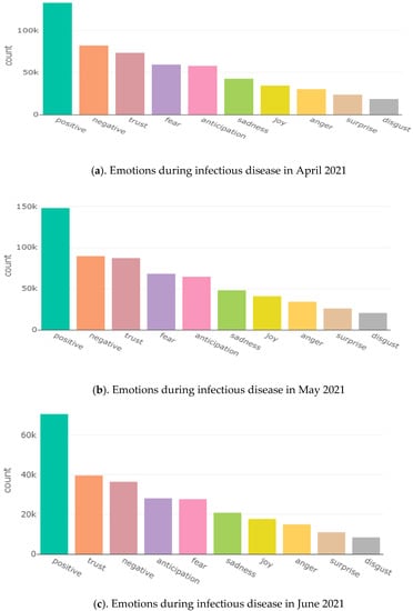 The order of expressing emotions in both the months of April and May 2021 is the same. This indicates that the pattern of expression and showing an awareness and capability level in social media usage for sharing information on infections is similar in April and May 2021. There are more positive tweets than negative tweets, as shown in Figure 1a,b. Twitter content for June 2021 showed the changes in the tweeting pattern of social media users. The high score for the emotion of trust indicates that people are confident about their social media participation and believe in the system for infection regulation.
