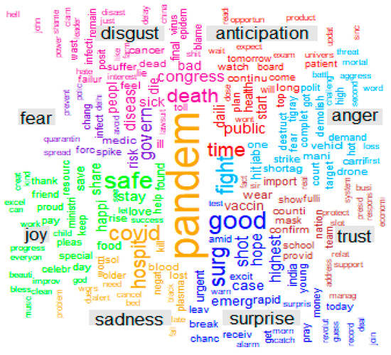 The most frequent words for emotions in June 2021 are shown in Figure 4. In common with the tweets for May 2021, the emotion of anticipation is depicted through time, public, tomorrow, long, and watch as frequent words. Fight, jab, opposite, court, and battle are frequent words used to show anger. The trust emotion is depicted through dose, import, nation, support, and policy words.