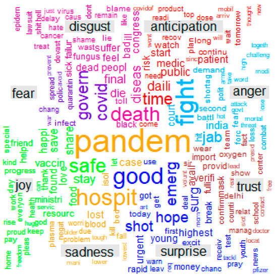 The most frequent words for emotions in May 2021 are shown in Figure 3. The emotion of anticipation is depicted through time, public, tomorrow, long, and watch as frequent words. Fight, jab, hit, court, and battle are frequent words used to show anger. Trust is depicted through words such as mask, import, oxygen, wear, and team. The frequent words good, hope, shot, urgent, and highest show the emotion of surprise. The emotion of sadness is shown through words such as pandemic, case, hospital, blood, and plasma. As in April 2021, safe, stay, happiness, share and save are used to exhibit the emotion of joy. The emotion of fear is shown through the words governance, quarantine, infect, and spread. The emotion of disgust is depicted through death, disease, fungus, suffering, and other frequent negative words.