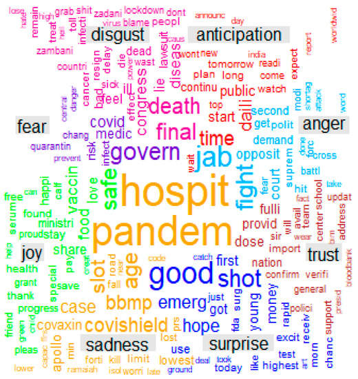 The most frequent words concerning different emotions are shown in Figure 2. For brevity, only five frequent words are mentioned to represent each emotion. Emotion anticipation is mostly depicted through the frequent words time, public, tomorrow, long, and watch. Fight, strike, destruct, court, and demolish are frequent words used to show anger emotion. The emotion of trust is depicted through vaccine, mask, wear, nation, and team words. The frequent words good, highest, hope, urgent, and case show surprise emotion. The emotion of sadness is shown by using the words pandemic, hospital, blood, and plasma. Safe, stay, happiness, share and save are the words used to exhibit the emotion of joy. The emotion of fear is shown through words such as governance, risk, spike, infect and spread. Disgust is depicted through death, disease, sick, which are both negative and positive frequent words.
