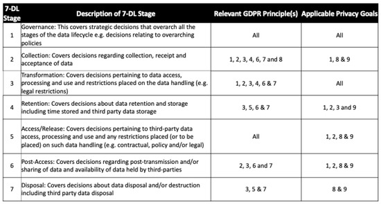 GDPR consist of 7 principles: Lawfulness, Fairness and Transparency (P1), Purpose Limitation (P2), Data Minimisation (P3), Accuracy (P4), Storage Limitation (P5), Integrity and Confidentiality (P6), and Accountability (P7) (Section 2.4, [39]). Thus, to ensure these principles are incorporated into 7-DL, an analysis was carried out that looked at each principle in turn to decide where within 7-DL that principle should be considered so that practitioners can be sure they have both fully safeguarded the data, and complied with GDPR throughout 7-DL.