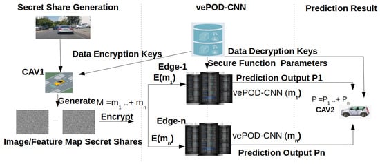 To address these issues, in this paper, we present vehicle–edge cooperative deep learning with privacy preservation for object-detection tasks, named vePOD for short. vePOD aims to protect the privacy of both the sensor data from vehicles and the object results generated by CNN from being exposed to and used by edge servers which execute the CNN inference jobs. In vePOD, we leverage the additive secret sharing theory to design secure functions for every layer in an object-detection CNN. A vehicle’s sensor data (e.g., a 2D image from an onboard camera) are partitioned and encrypted into two or more secret shares. Each share is transferred to and then processed on an edge server, which runs the object-detection CNN with secure functions on the secret share. The generated result from each edge server is then sent to the original vehicle (for workload offloading) or another vehicle (for workload offloading and data sharing), where the data are combined to obtain the detected objects. The entire process is configurable. When the vehicle–edge communication latency is high, a vehicle can help by executing the first several layers in the detection network and then send the secret shares of feature maps to edge servers for the remaining compute-intensive processing. This vehicle–edge cooperative computing paradigm can protect data privacy, reduce communication cost, and improve application performance.