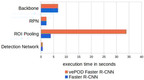 For Faster R-CNN, the feature map generation using a backbone CNN takes 6.8 s, which accounts for 53.3% of the execution time. This is because the number of neural networks in the CNN backbone is more than five times the number in other parts of the detection network. VePOD Faster R-CNN takes a similar amount of time to generate feature maps and region proposals, as it uses the same CNN backbone and RPN network as Faster R-CNN.