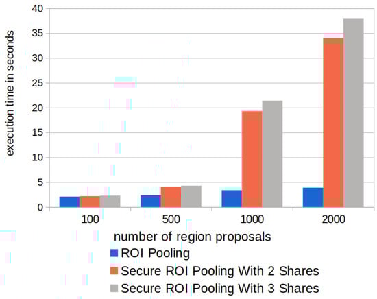 To gain a deeper understanding of the preceding result, we study the impact of the number of region proposals on the performance of secure ROI pooling. Figure 6 presents the results. Faster R-CNN uses fixed-size input feature maps (50 × 50 × 512, i.e., width, height, and channel). The number of region proposals directly influences the execution time of the secure function. The time is comparable when there are 100 or 500 region proposals. Specifically, for 100 region proposals, the original ROI pooling takes 1.7 s and the secure ROI pooling uses 1.9 s. However, when there are over 1000 region proposals, the execution time differs more; i.e., the original ROI pooling takes 3.9 s to process 2000 region proposals. In contrast, the secure ROI pooling uses 34.0 s. In addition to the number of region proposals, the shape of the ROI affects the performance of the secure ROI pooling as well. More specifically, larger ROIs lead to an increased execution time caused by secure operations to construct the relative difference tables; for example, an ROI with size 12 × 12 (width, height) takes an additional 0.007 s computation time compared to an ROI with size 3 × 3.