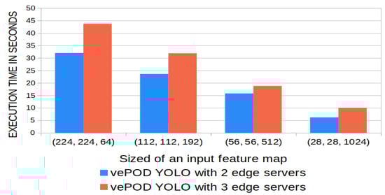 The execution time of secure max pooling, as shown in Figure 9, increases linearly with the size of the input feature map. The size of a feature map equals the product of the width, height, and the number of channels of the feature map. For example, vePOD YOLO’s execution time with two edge nodes is 15.17 s with input size 56 × 56 × 512 (width, height, channel), and execution time for a feature map of input size 224 × 224 × 64 is 32.4 s. The execution time ratio equals the ratio of the total number of features in the input feature map because the secure function is executed on every pooling region iteratively with identical time complexity. VePOD Darknet CNN consists of four secure max-pooling layers, and their execution time varies. The ratio of the execution time between the four layers matches the ratio of the corresponding size of their input feature maps. The ratio of the four layers’ execution time and feature map size is 4:3:2:1. The execution time of vePOD YOLO with three nodes is longer than two nodes with the same input size. For example, with an input feature map size of 56 × 56 × 512, the execution time for two and three nodes is 15.6 s and 19.2 s. Compared to two nodes, the secure function for three nodes needs to combine an extra piece of data to retrieve the difference of feature value in every location, which causes an additional delay in performance.