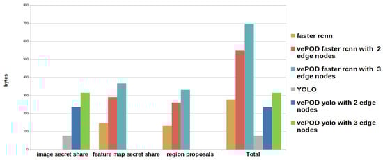 Secret shares need extra storage space. In Figure 10, we can see that vePOD Faster R-CNN on two edge servers for each vehicle’s image needs 280 bytes of additional space to store secret shares compared to using the feature maps. VePOD YOLO under the same setting takes an extra 160 bytes compared to using the raw image.