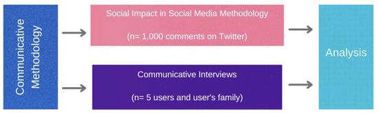 This research is an exploratory study that integrated two different research techniques developed within the Communicative Methodology [57]. Firstly, the Social Impact in Social Media Methodology (SISM) [58] was used to analyse comments on the video game posted on the social network Twitter. At the same time, six communicative interviews were conducted with users, one of whom was a family member of a user. Figure 1 shows the process established in the data collection for this research.