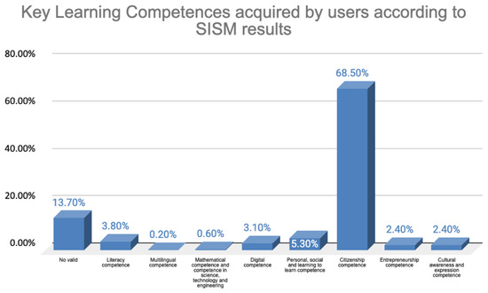 The results of the analysis of the 1000 comments made by players show that 86.3% exhibited some kind of learning, while 13.7% were discarded as they were not related to the object of study. Of all the competences acquired, the one that stands out is the citizenship competence with 68.5%, followed by the personal, social, and learning to learn competence with 5.3%, literacy competence with 3.8%, and digital competence with 3.1%. In relation to the entrepreneurship and cultural awareness and expression competences, each category represented 2.4% of the comments, while mathematical competence and competence in science, technology, and engineering represented 0.6% and multilingual competence 9.2% of all comments (see Figure 2).