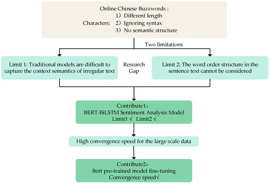 Text sentiment analysis, which can extract the sentiment content of texts, is a common application of natural language processing (NLP) and opinion mining. Moreover, sentiment analysis of online Chinese buzzwords (OCBs) is important in the real world. Specifically, sentiment analysis of OCBs (1) helps microblogs, games, and other online platforms to shield against some improper language, (2) purifies the online environment, and (3) precisely grasps the emotional direction of users. OCBs reflect the real life of society spreading through the Internet. OCBs are also are a kind of living language form [], which is widely used, produced, and applied to the network. OCBs are emerging and changing, and about 1000 OCBs are generated every year and used by millions of users. OCBs are synonymous with Internet language, which refers to a language generated from the Internet or applied to Internet communication, mainly from online games, chat and comments, and other online social platforms. They usually consist of a mixture of Chinese characters, numbers, English letters, and symbols, such as the harmonic word “鸭梨山大”, the superposition “绝绝子”, and the abbreviation “高大上”, etc., often expressing special meanings in specific online media communication. OCBs vary in length, ignore grammar, and have no complete semantic structure []. Compared with ordinary text, OCBs can be spread rapidly because they are grounded, personal, creative, short, and interesting [].