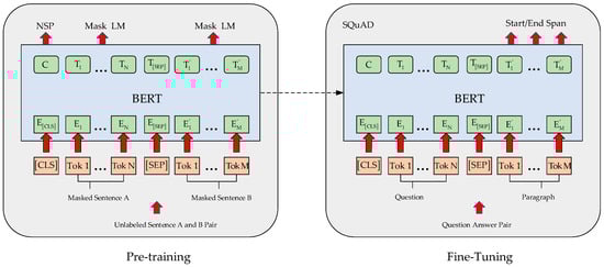The BERT model has shown strong advantages in tasks such as text classification and sentiment analysis []. Therefore, the BERT model is most likely very suitable for OCBs with strong semantic pertinence and polysemy. BERT is a transfer learning pre-trained neural network model []. The Transformer-based bidirectional encoder of this model can take into account the information before and after the word when processing a word so as to obtain the semantics of the context of the word. The basic model of BERT has 12 stacked encoding layers, each encoding layer has 12 self-attention heads, and each feed-forward layer has 768 hidden units, and the output of the final model, which is the input of the downstream task, provides high-quality word vectors []. As shown in Figure 2, BERT is pre-trained through a large-scale corpus, which leads to model network parameters suitable for general NLP tasks. It then is fine-tuned to adapt the model to specific downstream tasks.