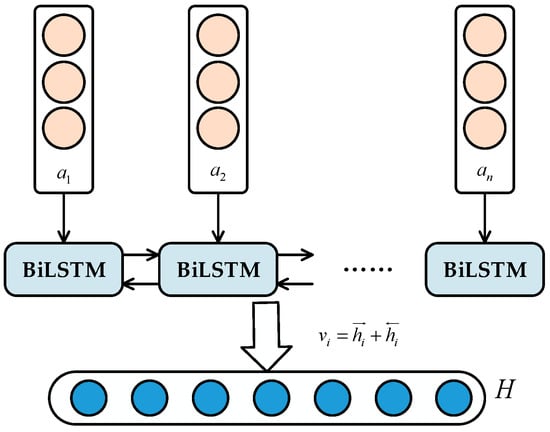 The formulas for the state at each moment of the model are shown in Equations (7) and (8). The final state is jointly determined by the state of the BiLSTM, as shown in Formula (9) later.