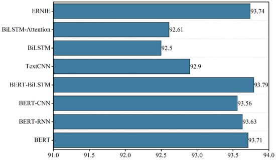 The proposed model uses BERT pre-training model and BiLSTM model. Because the experimental results show that the BERT–BiLSTM combined model has a better effect on emotion analysis than the above two models, it is compared with these two models in the ablation experiment [] to prove the superiority. In this study, the following three models for emotional polarity classification were benchmark-tested because they achieved good results. In order to maintain fairness, the parameters are consistent with the previous experiments. The three models are as follows: