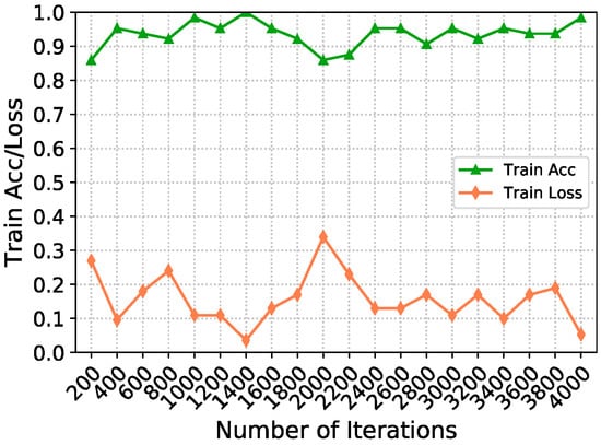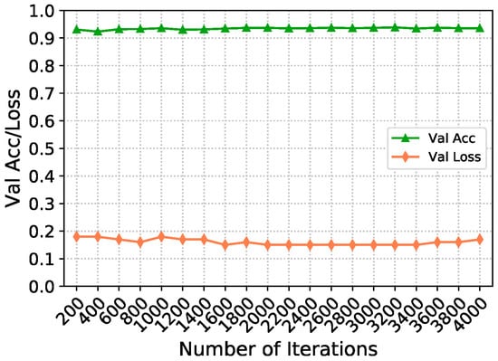 In order to verify the stability of the model, we compared the performance of the model’s accuracy (Acc) and loss in the training set and verification set at different iterations. Comparing Figure 9 and Figure 10 shows that the model has strong stability and good training effect. The final validation (Val) Loss and Val Acc on the test set are 0.15 and 93.74%, respectively.