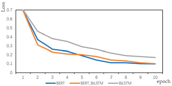 According to Table 4, the results of the proposed BERT–BiLSTM model on the OCBs dataset are better than those of the other models. First, the F1-score of the BERT–BiLSTM model is the highest, which means that the model has strong comprehensive ability and good generalization performance. Second, the recall value of the BERT–BiLSTM model is also the highest compared to other models. This also shows that the number of positive samples identified by the model is the best, and the coverage of training samples is wide. It reflects the sensitivity of the model. Third, in terms of precision, BERT–BiLSTM performs well. Its value is close to BERT, slightly (only 0.54%) worse than BERT–CNN and BERT–RNN. This is due to the high recall rate of the model, which indirectly leads to a decrease in the accuracy rate. Notably, the ability of the BiLSTM model to learn text context features is more prominent, so the results of the three models, BERT–BiLSTM, BiLSTM, and BiLSTM–Attention, are better in terms of recall and F1-score values. The BERT–BiLSTM model has the best training results. This proves that the word vector obtained by using the BERT pre-training model contains more complete context information, which is conducive to extraction of text information by the subsequent model.