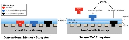 - Data stored on the device’s memory: Assuming a QC algorithm succeeds in overcoming the access authentication barrier, it will be able to access all the exposed and discoverable data. However, ZVC stores all private data on NAND memory hidden behind two security gates. To pass those gates, the remote QC must run its algorithms locally on the device in the same fashion as typical malware, i.e., it must be installed on the device, and execute its algorithm. ZVC bans all third-party permissions at the hardware level not only to run any non-native algorithm locally but also to find and recognize the data on the device targeted for breaching. A QC can run its access-breaching algorithm remotely to break the encrypted access credentials, but once the access is breached, the QC cannot transfer codes to run locally in the absence of third-party permissions. In other words, breaking the encryption for access authentication is of no avail, as no further local execution of any remote malicious code is possible for compromising the ZVC-secured data. ZVC secures the native data by setting up two gates that need to be passed before the data become accessible, as illustrated in Figure 4.