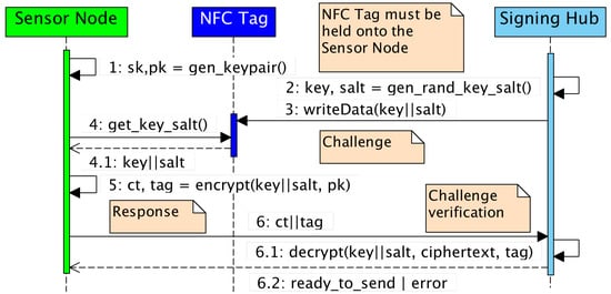 The Signing Hub is comprised of a TPM connected, in this case, to a Raspberry Pi microcontroller. Additionally, it has an NFC-Reader attached to its serial port allowing for NFC tags to be read and written. The main challenge–response protocol of the NFC-KE is depicted in Figure 1.