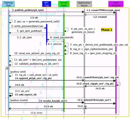 To remedy this problem, Dreyer et al. also proposed an extension to the former NFC-KE protocol that is using the HLF Blockchain for a more decentralized data storage of the public keys [,]. The new approach essentially replaces the standard filesystem-based storage approach of the NFC-KE scheme in favor of a Blockchain-based approach. Instead of storing and implicitly validating the newly exchanged Sensor Node’s public key on the Signing Hub device itself, this functionality is outsourced to an external Blockchain Platform, in this case, HLF. The authors showed that using their approach, the NFC-KE experiences, on the one hand, a decrease in performance while, on the other hand being more tolerant against system outages, tampering attempts and unauthorized access due to the higher redundancy and tamper resistance of the HLF platform.