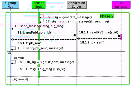 For their new approach, the authors introduced two new network participants, one being the Application Server and the other being the HLF instance (s. Figure 2 and Figure 3). Generally, the Application Server is responsible for validating the requests originating from the Signing Hub on a network level and passing them on to the HLF instance. The latter is responsible for performing upper-level validations such as permission control and signature verification. Since HLF offers a fully programmable Smart Contract runtime, every signature verification can be performed on-chain, thus enabling an enhanced distributed trust. Additionally, each Sensor Node’s public key, after being successfully exchanged, is stored within the World State of the HLF platform. This eliminates the need for a distinct file for each new key and thereby reduces the chances of arbitrary file tampering. For further details on the inner workings of the general extension scheme, the reader is referred to [].
