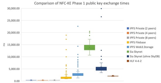 In general, the performance numbers lead to the conclusion that the IPFS private setup is the most reliable and, in terms of performance, the most responsive solution for a high-performance system. Other implementation candidates on the IPFS basis have shown to be capable of being a proper alternative to the existing HLF NFC-KE extension because their performance numbers are either lower or equal to each other. Only the Sia Skynet solutions did not prove to be a valid replacement alternative for the HLF approach due to significantly higher execution times among all test scenarios. There are some additional points to the HLF performance results that need acknowledgement. First, the HLF implementaion requires a consensus among all participants to synchronize the underlying Blockchain state. Only after this process is complete, the stored data can be queried by external parties. Furthermore, HLF internally performs multiple cryptographical operations such as signing, verifying, and hashing transaction data, thereby increasing performance numbers. These points all add up to form the resulting performance of HLF.